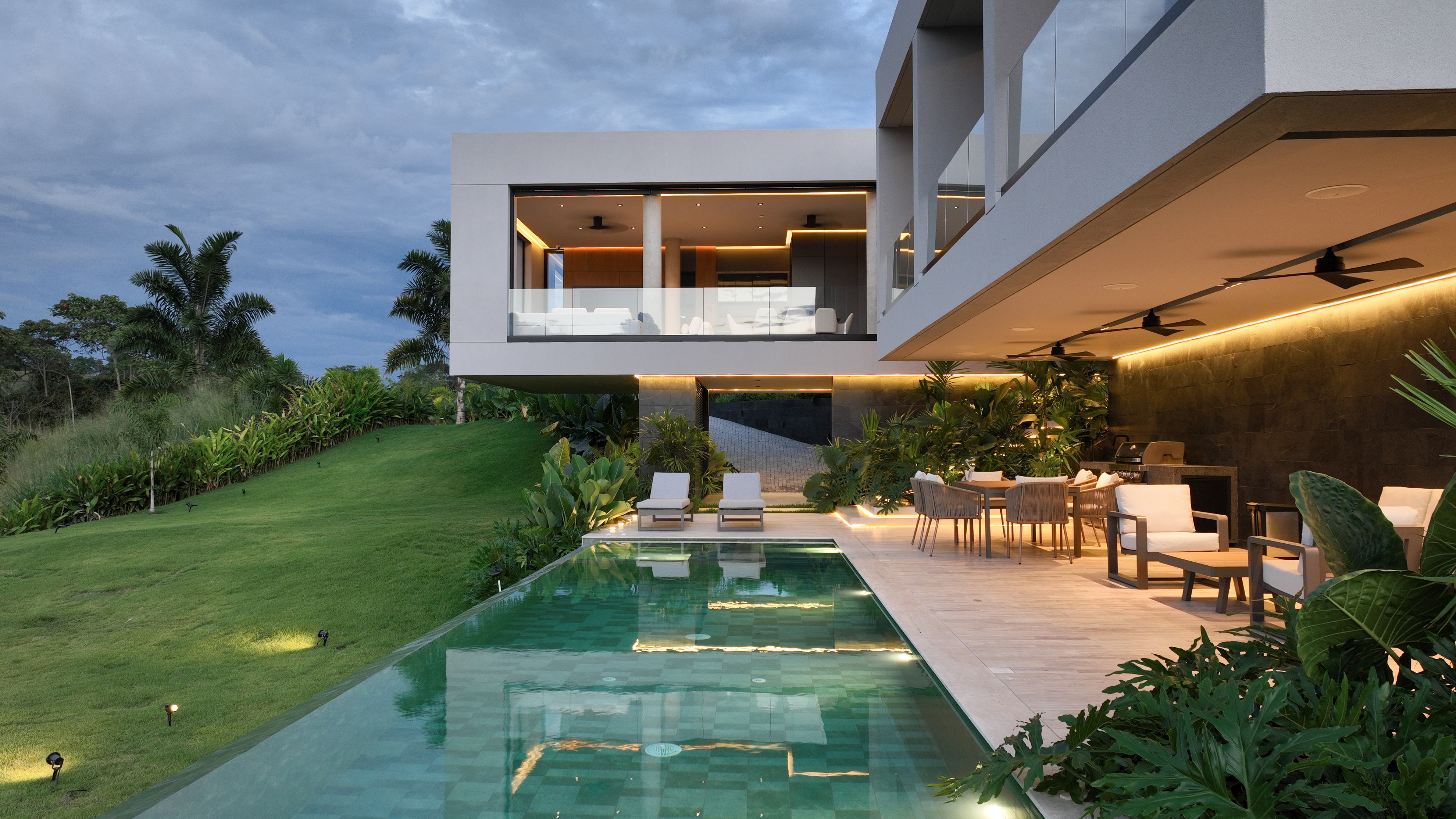 Sin embargo, al atravesar el acceso, la percepción cambia por completo. La casa se abre hacia el interior y hacia el paisaje posterior, revelando una arquitectura expansiva donde los espacios sociales se extienden hacia la terraza y la piscina. El límite entre adentro y afuera se diluye, permitiendo que la luz, el aire y la vegetación se conviertan en parte activa de la experiencia cotidiana.