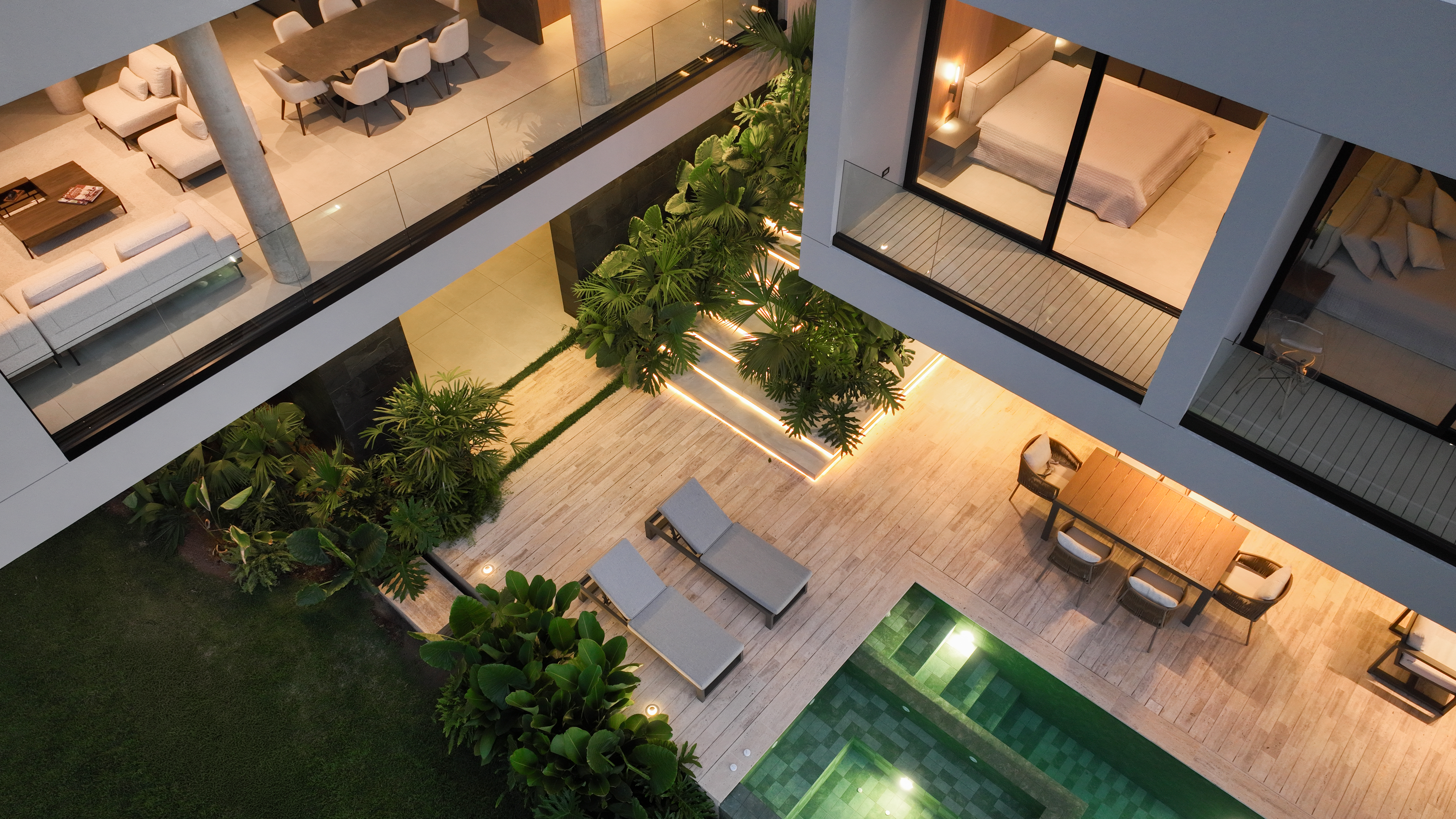 El vacío central organiza la vivienda y articula las circulaciones, generando una secuencia espacial que alterna compresión y apertura. Cada recorrido está pensado como un descubrimiento gradual, donde la arquitectura no se muestra de inmediato, sino que se revela paso a paso.